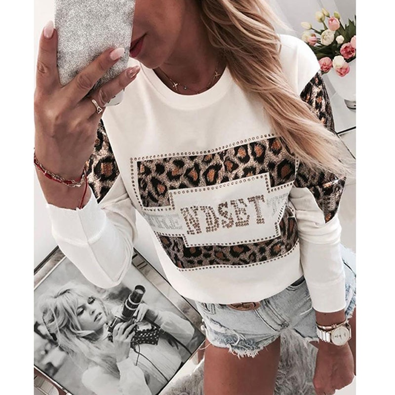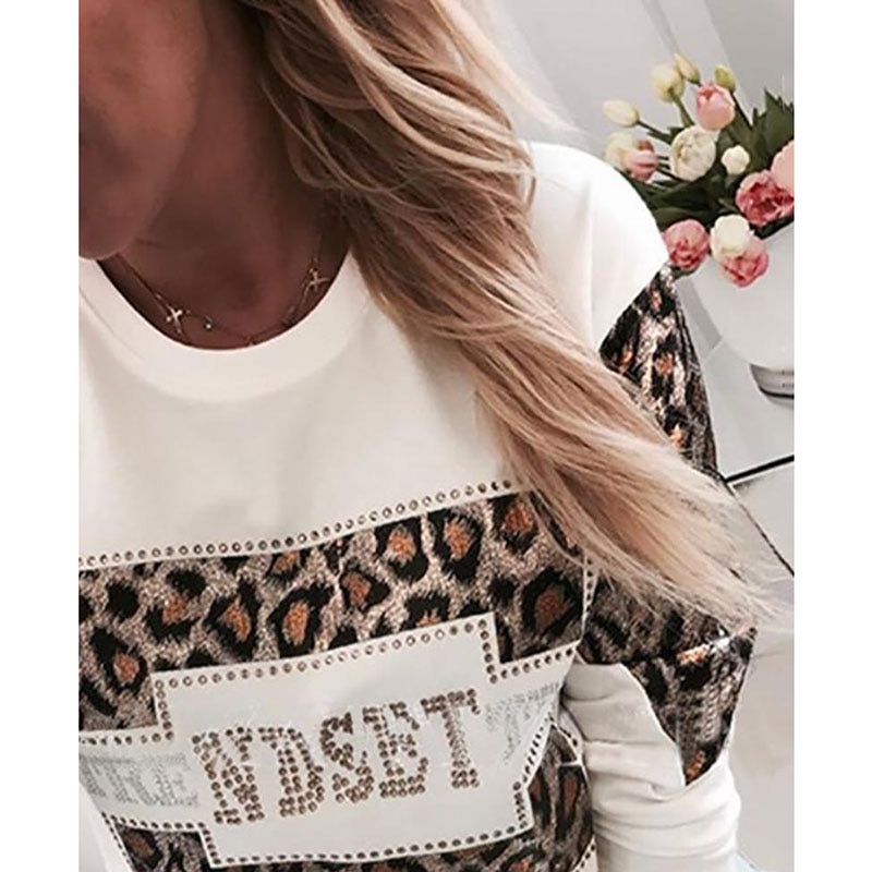 Women Long Sleeve T Shirt Leopard Print Rhinestone Embellished Detail Tops Casual O Neck Spring Tshirt