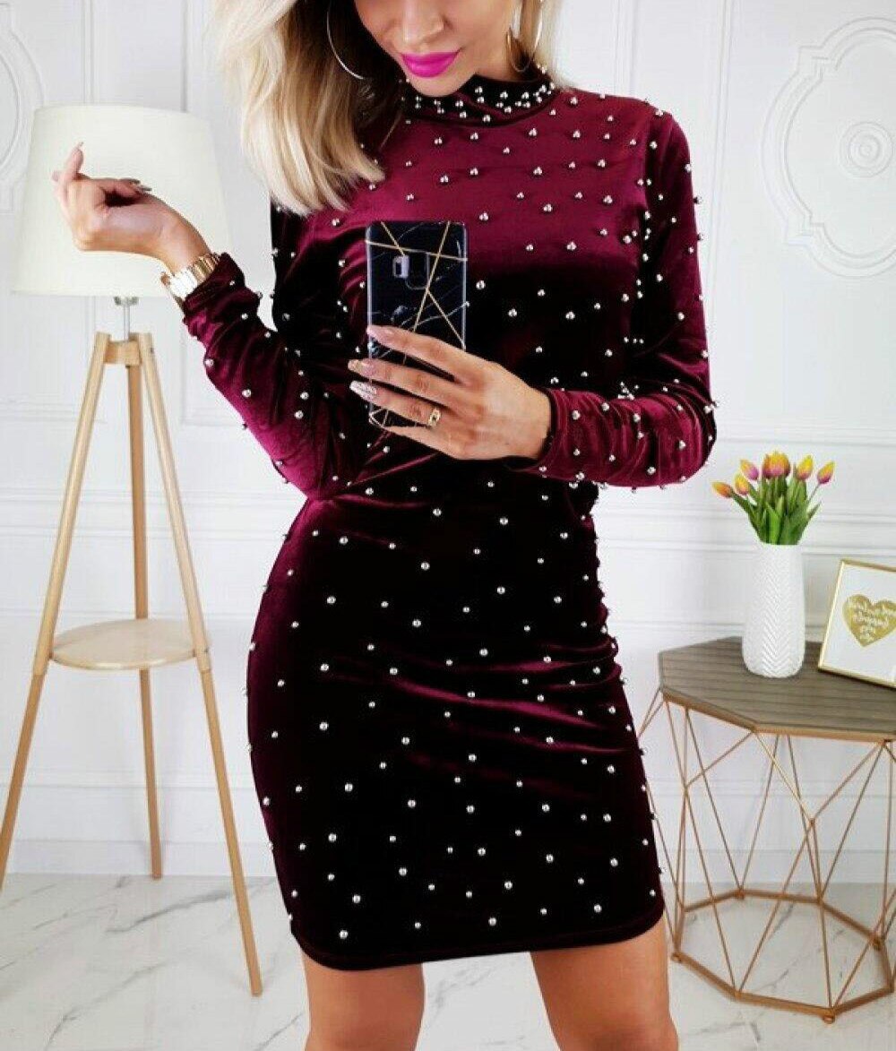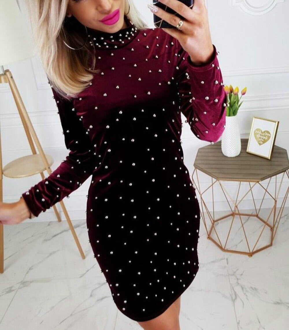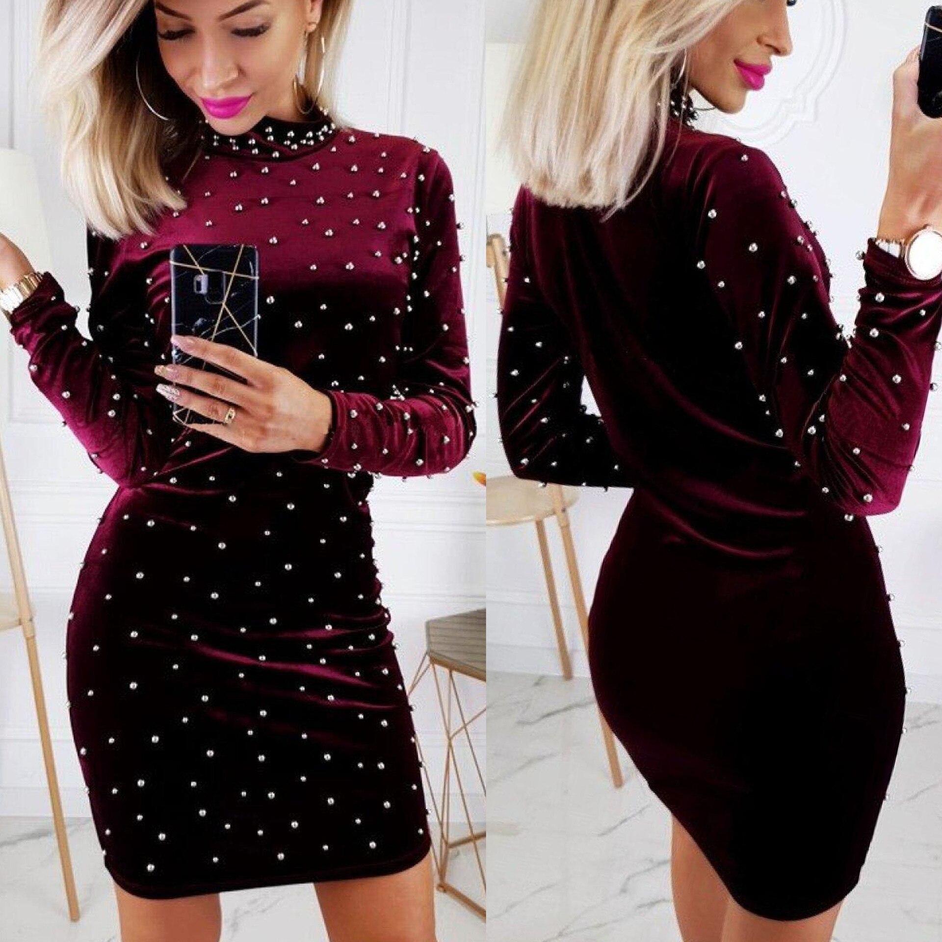 • Women Party Night Club Wear Bodycon Dress Sexy Round Neck Beading Long Sleeve Skinny Women Mini Dress Sexy Dress - Hplify