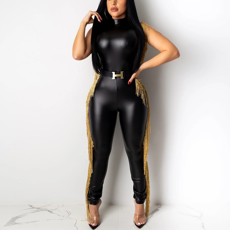 Women Pu Leather Jumpsuit High Neck Sleeveless Tassel Detail Womens Romper and Jumpsuits Slinky Club Outfits Pu Overalls - Hplify