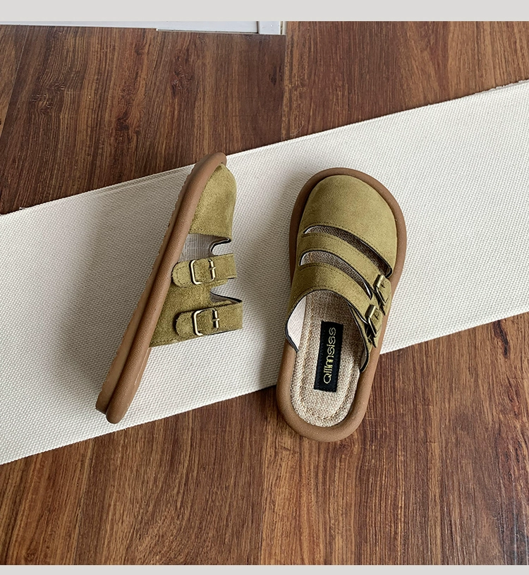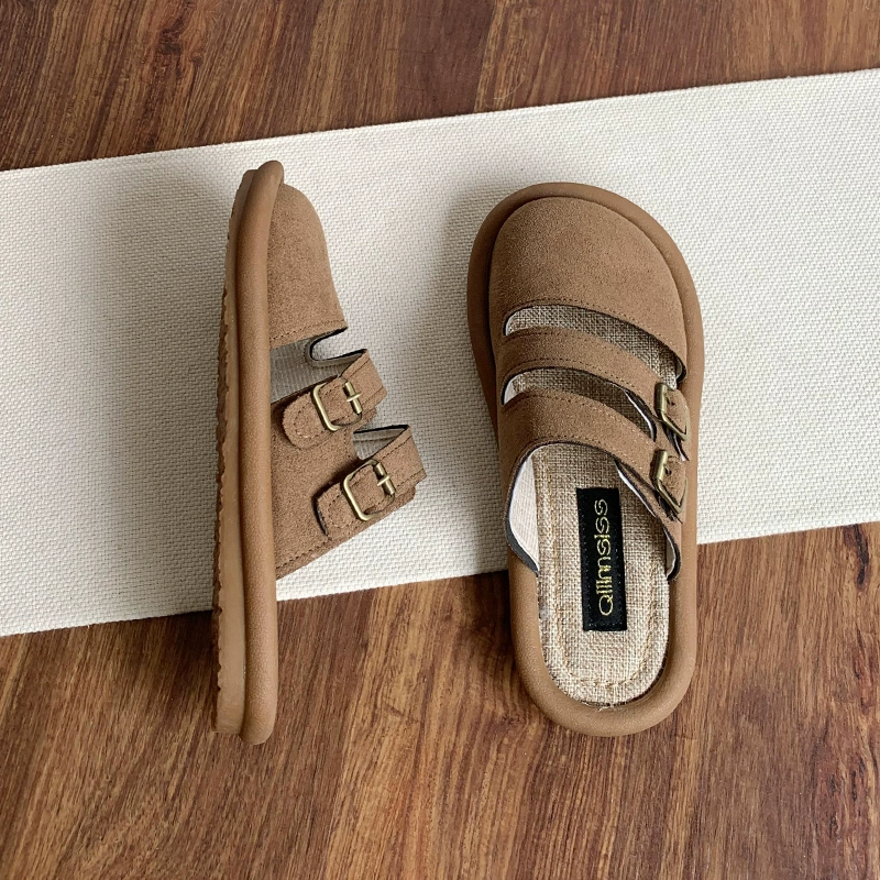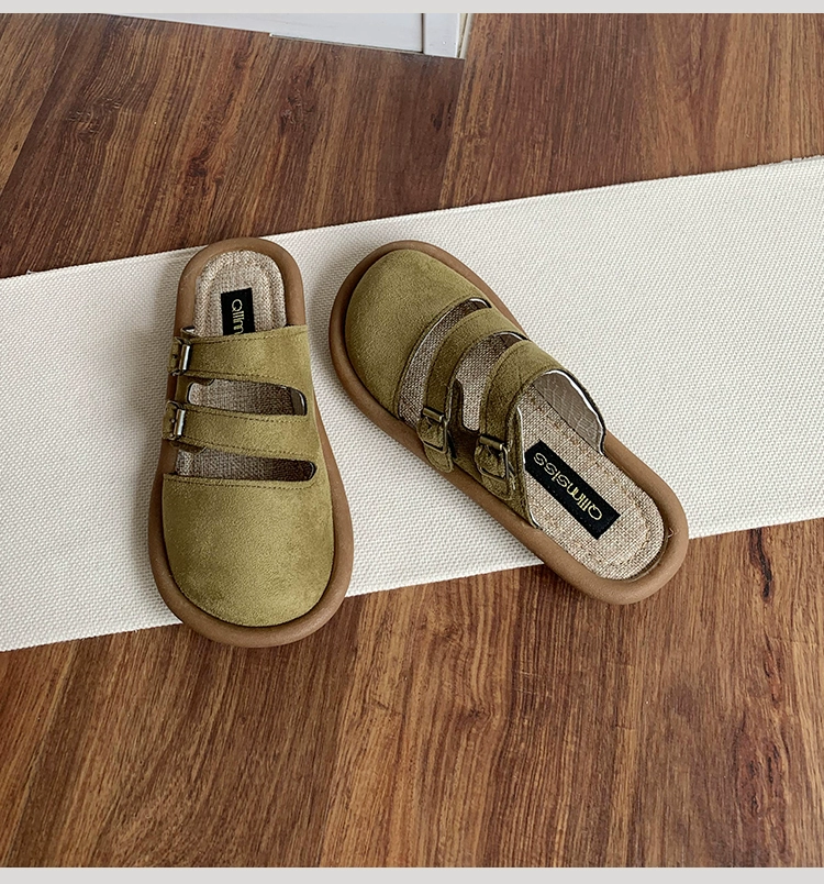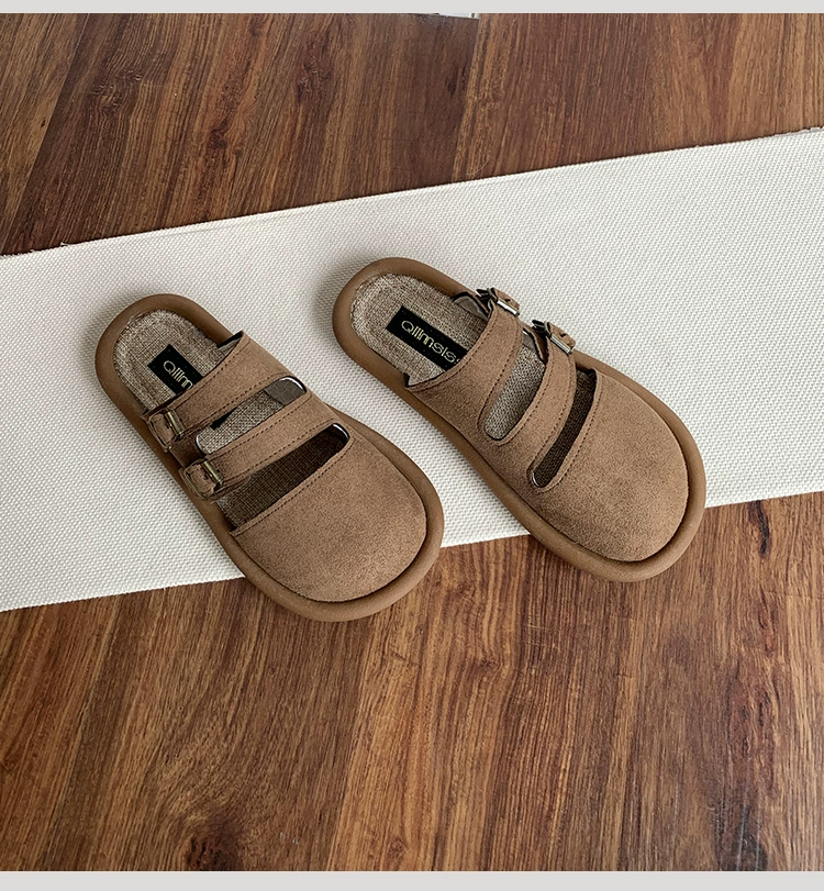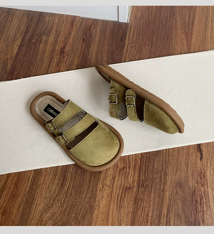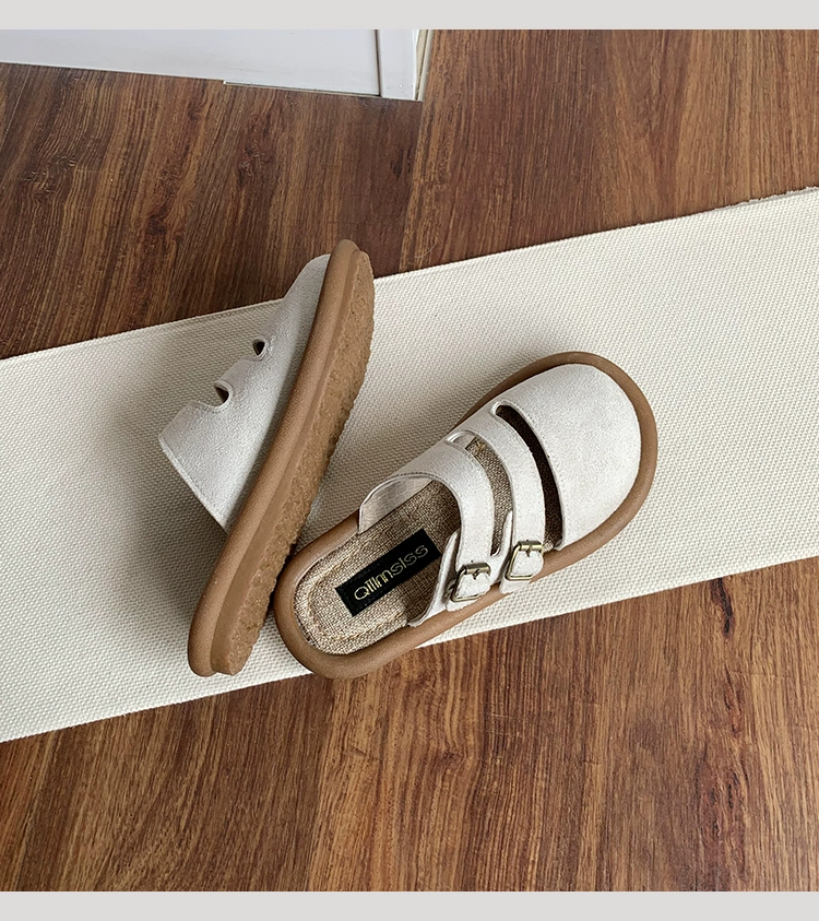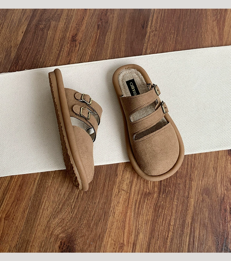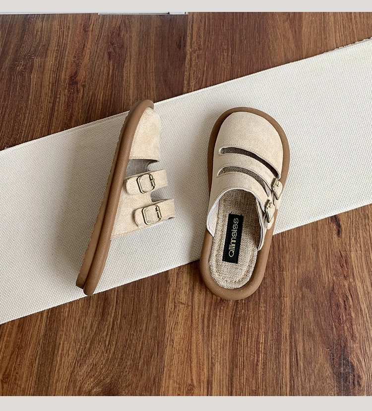 Women Sandals Toe-Covered Slides Hollow Out Belt Buckle Suede Flat Rubber Sole