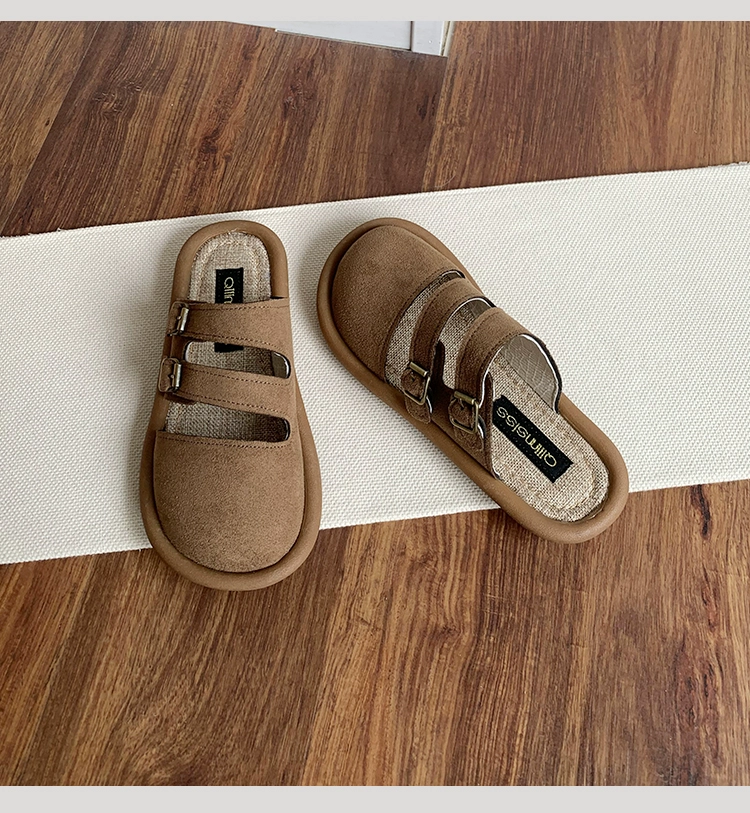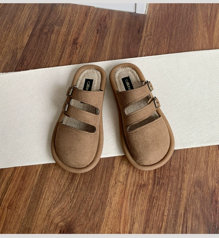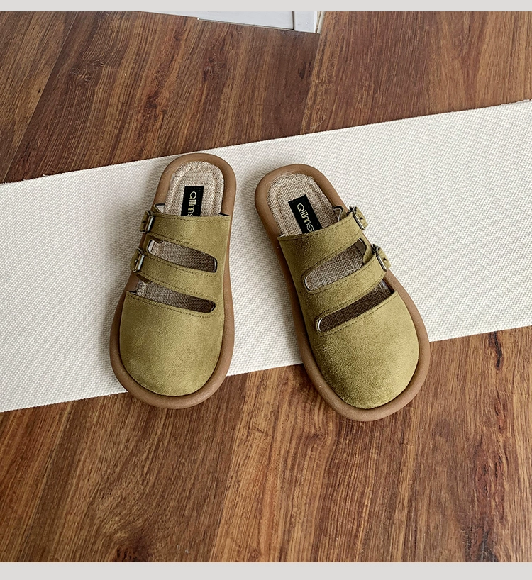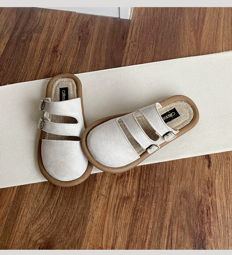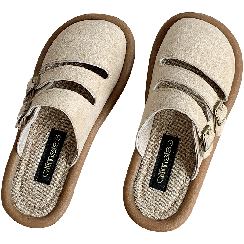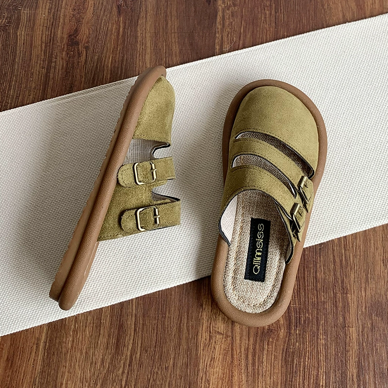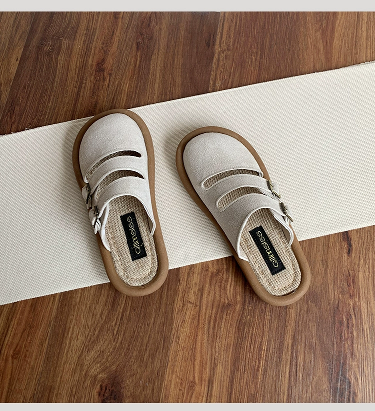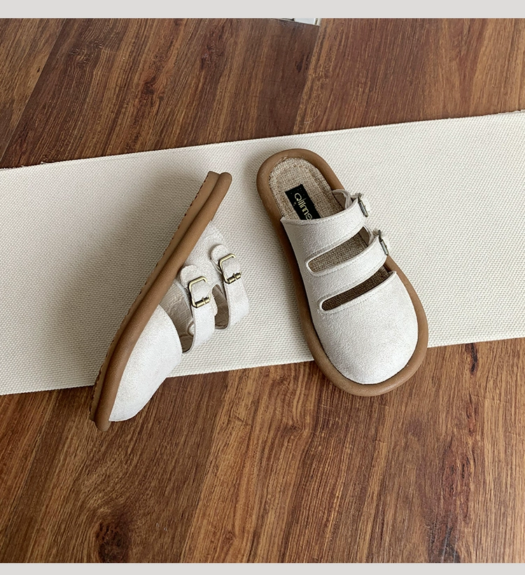 Women Sandals Toe-Covered Slides Hollow Out Belt Buckle Suede Flat Rubber Sole