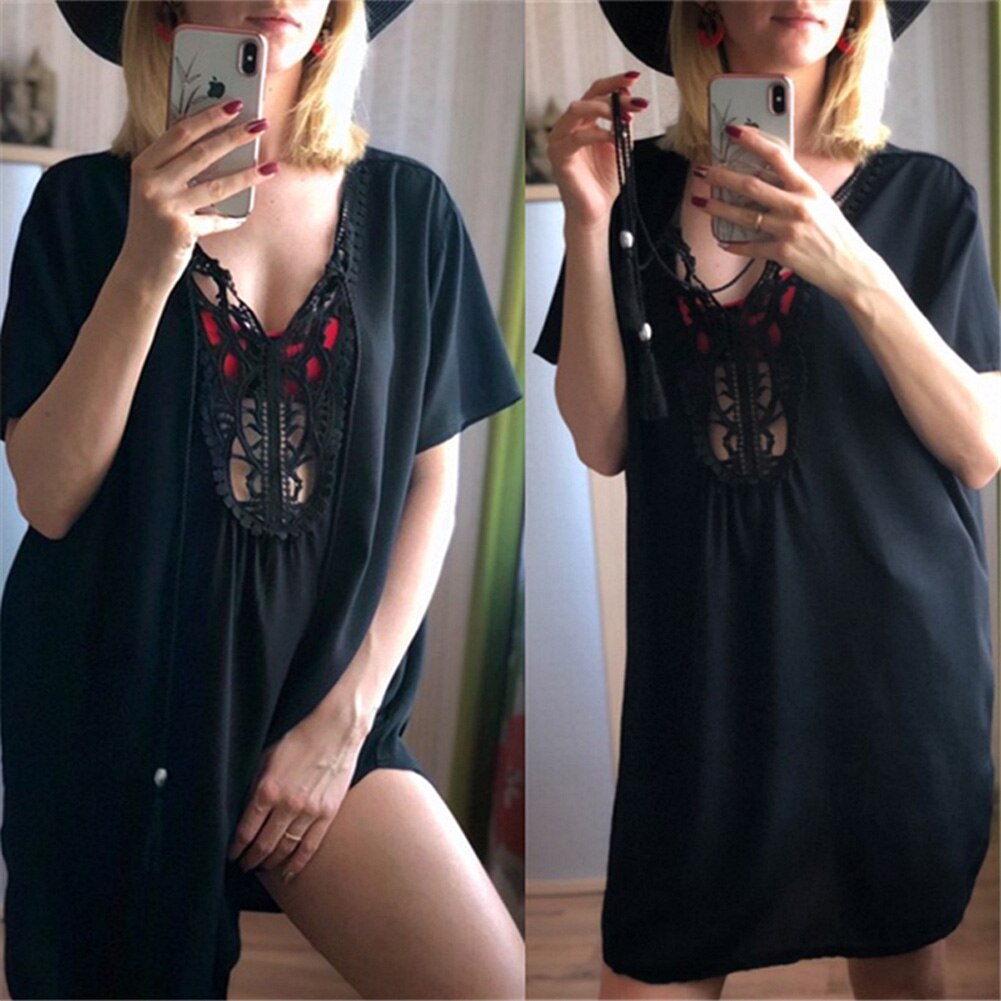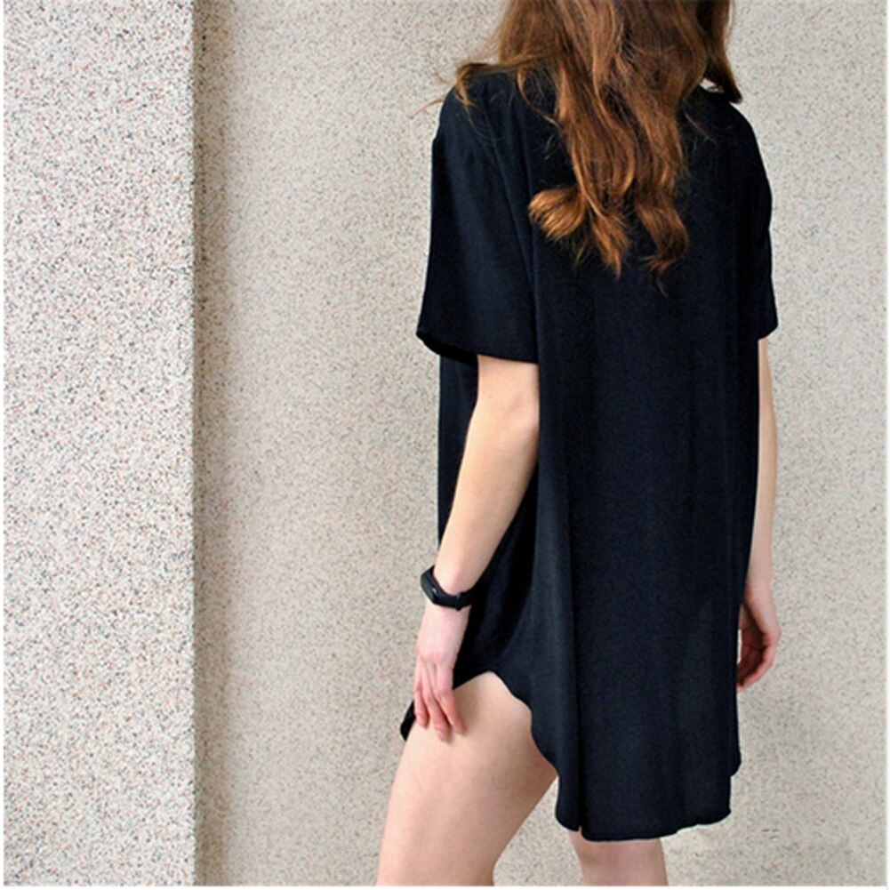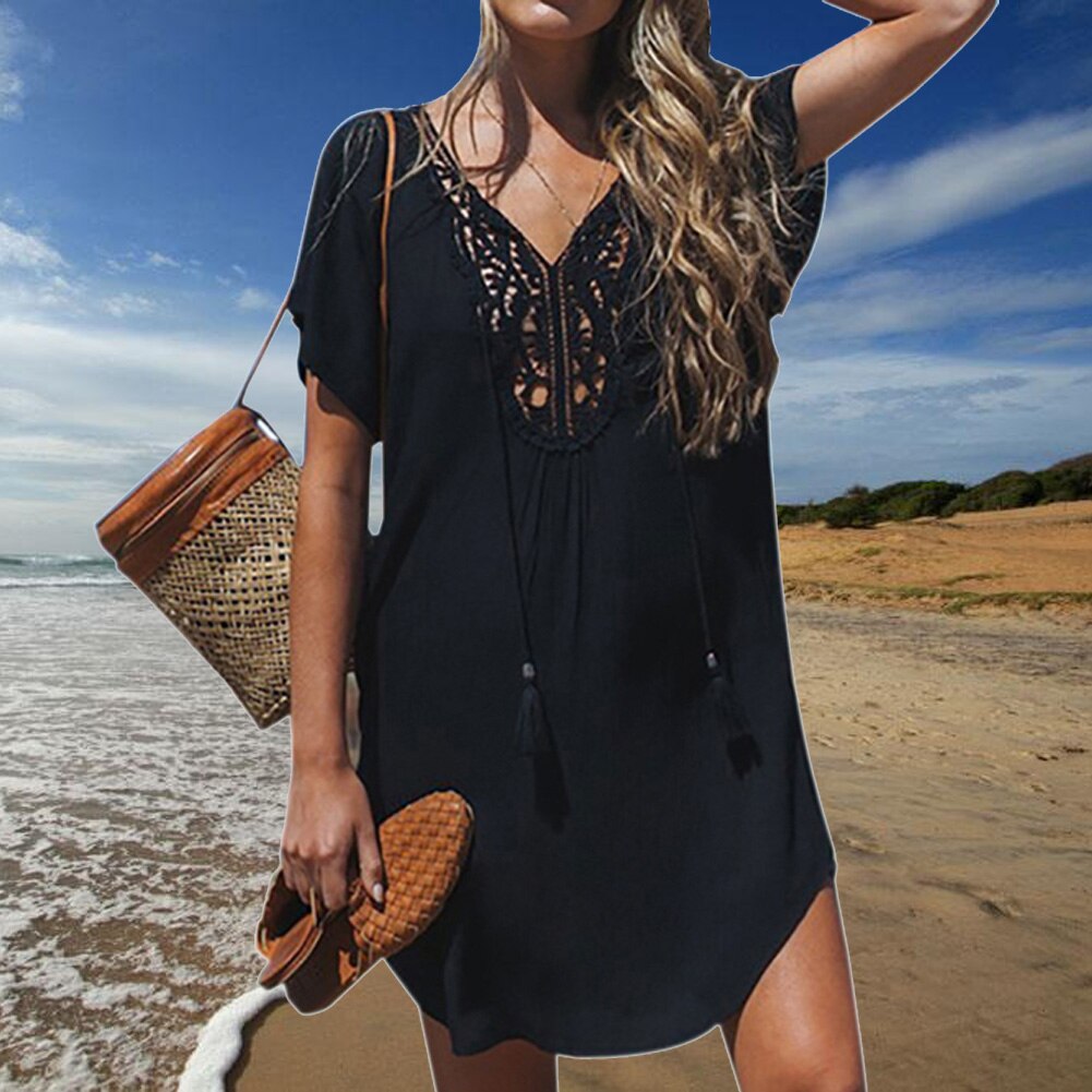 The Best Women Short Sleeve Loose Mini Dress Ladies Summer Shirt Solid Casual V-Neck Holiday Beach Dress Sundress Online - Hplify