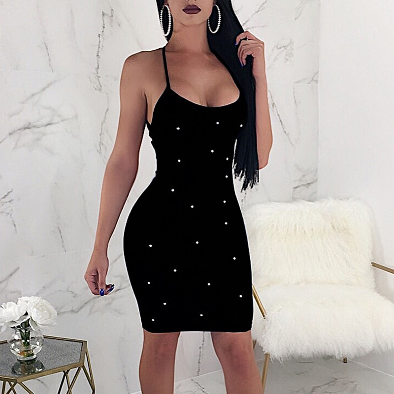 Women Spaghetti Strap Beading Bodycon Dress Club Party Backless Crisscross Black Dress Slinky Short Dresses - Hplify