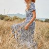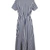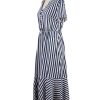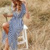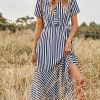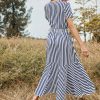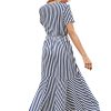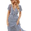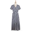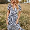 Women Spring Summer V Neck Short Sleeve Button Striped A Line All Match Causal Long Dresses