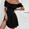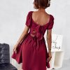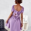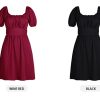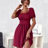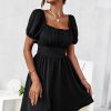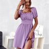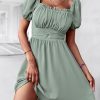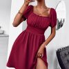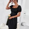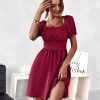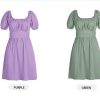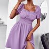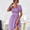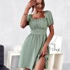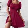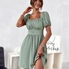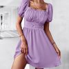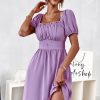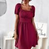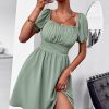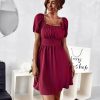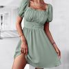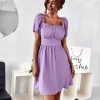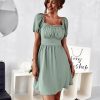 Women Summer Square Collar Short Sleeve Solid Color High Waist A Line Romantic Small Dress