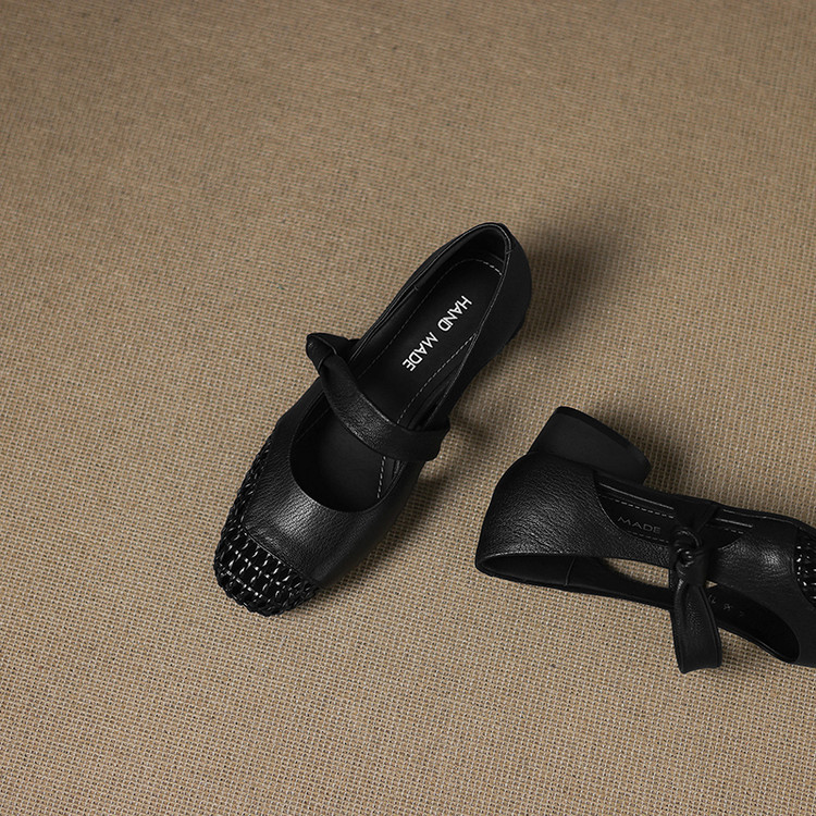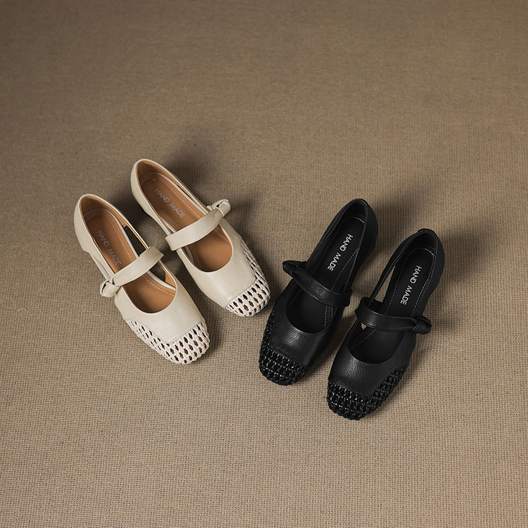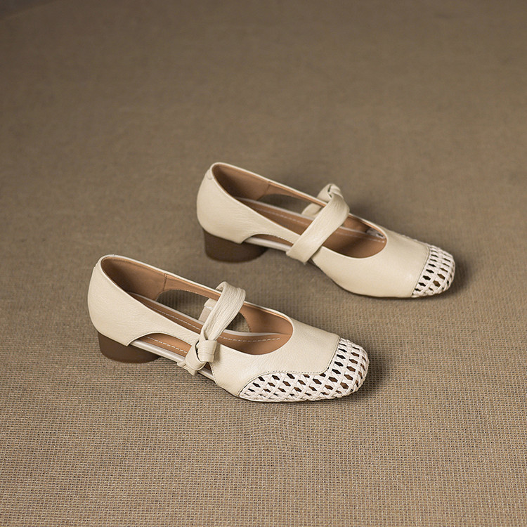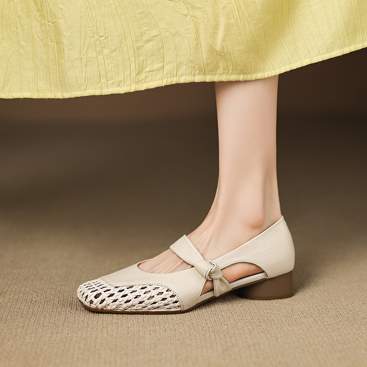 - Design Details: Cutout pattern, round toe, knot – detailed strap, low thick heel