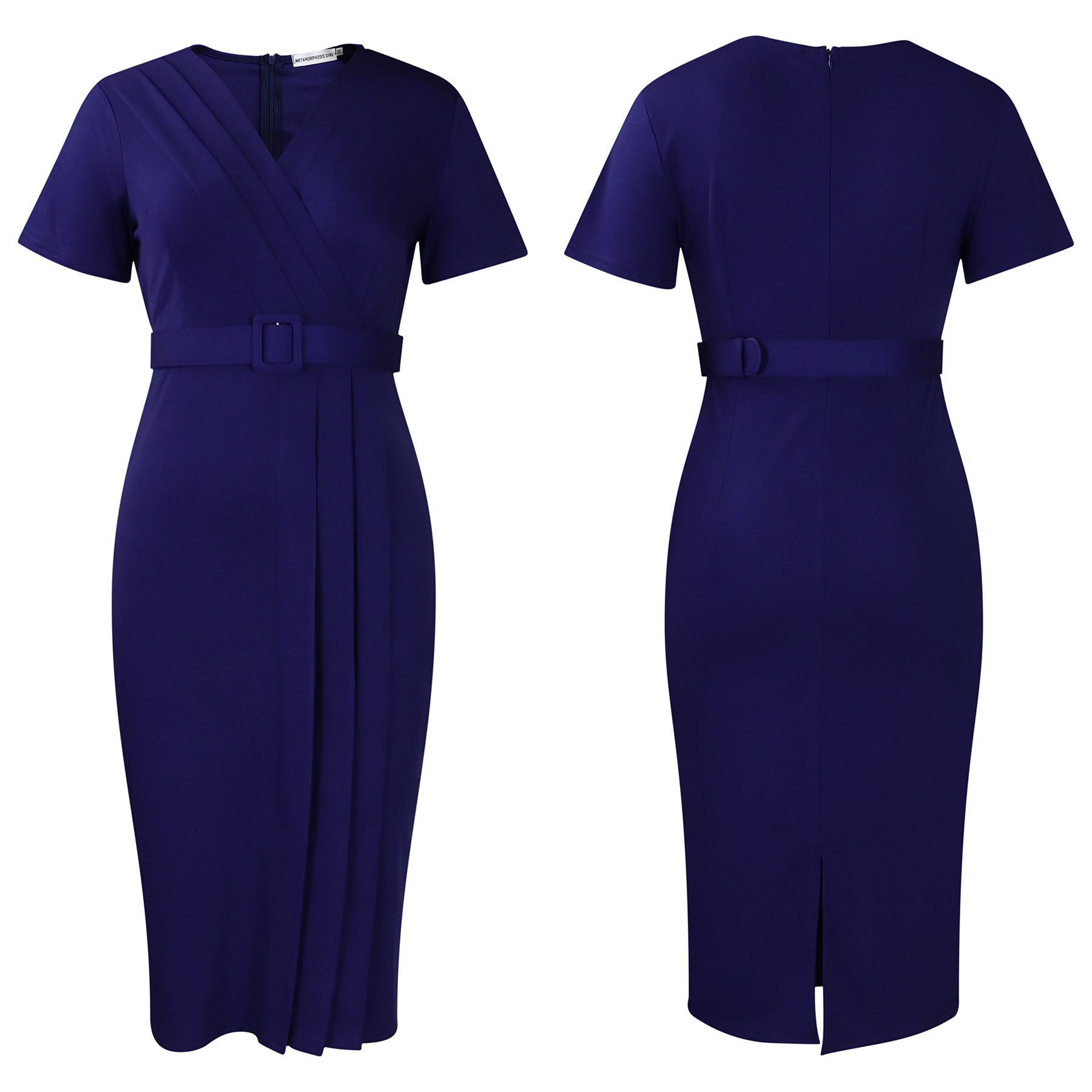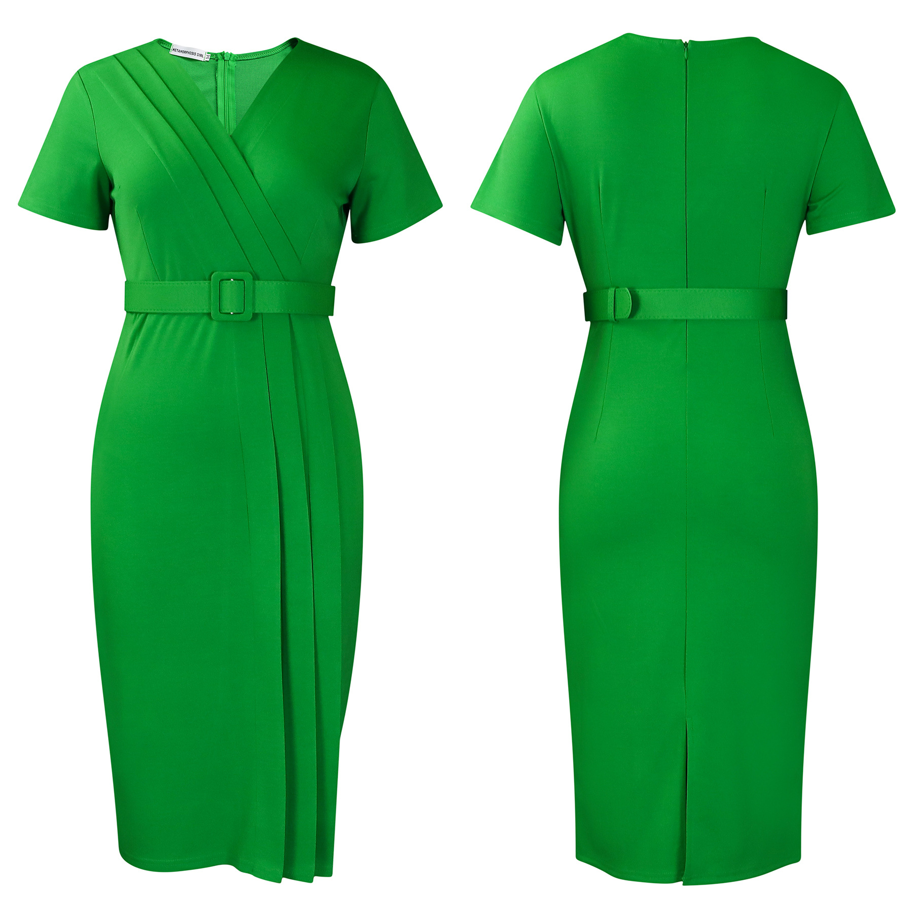 Womens Elegant Solid V-Neck Short Sleeve Belted Pencil Midi Work Dress