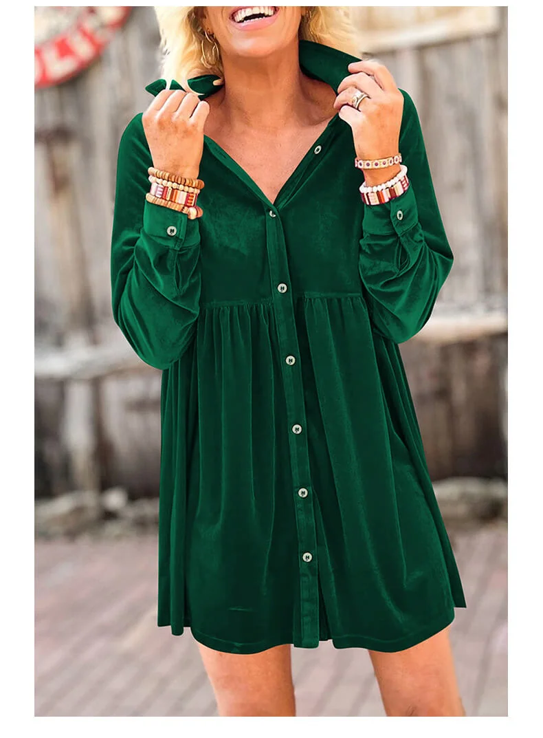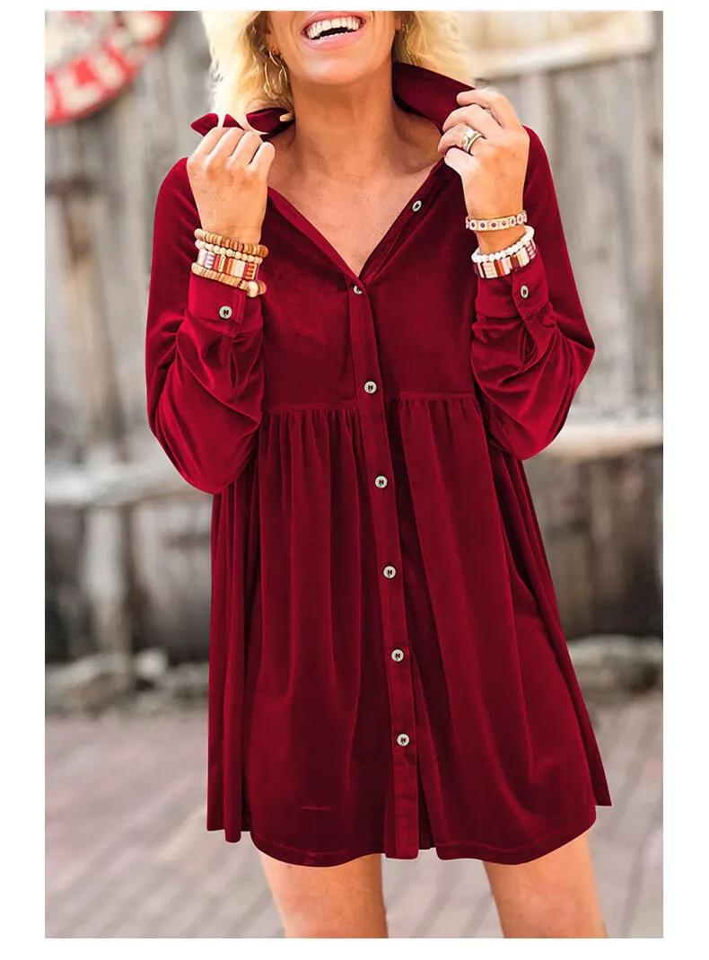 Womens Elegant Velvet Shirt Collar Long Sleeve High Waist Mini Dress