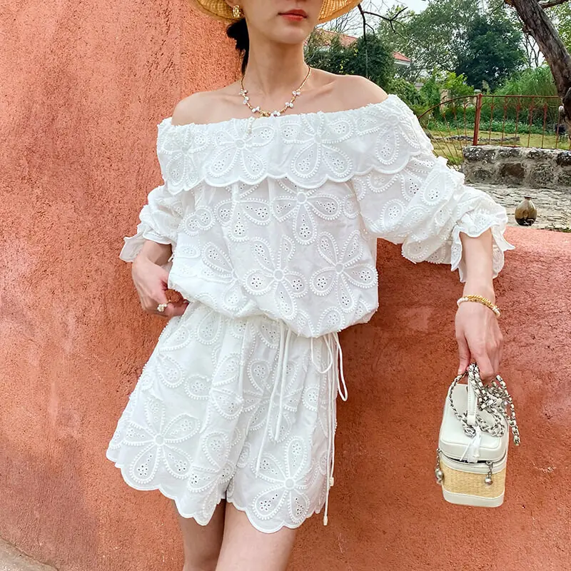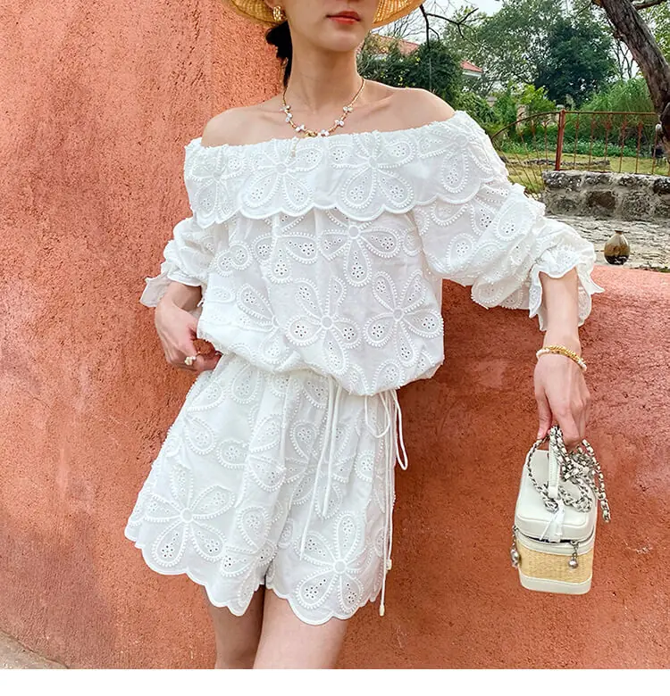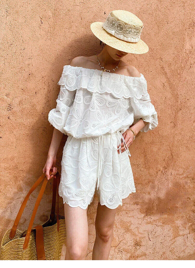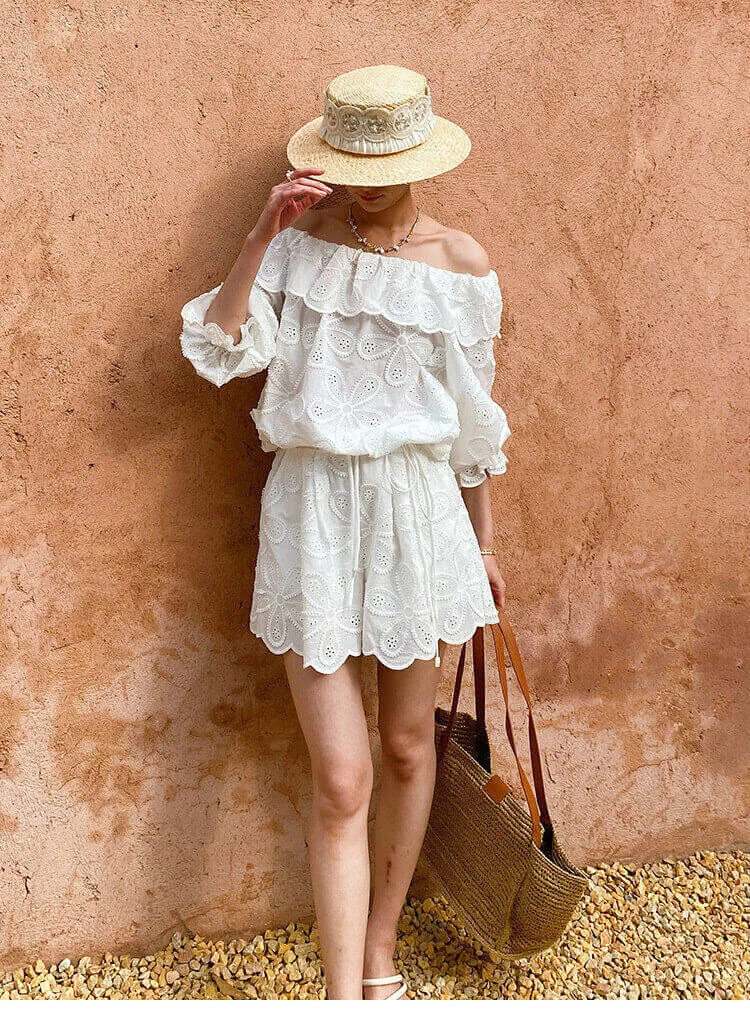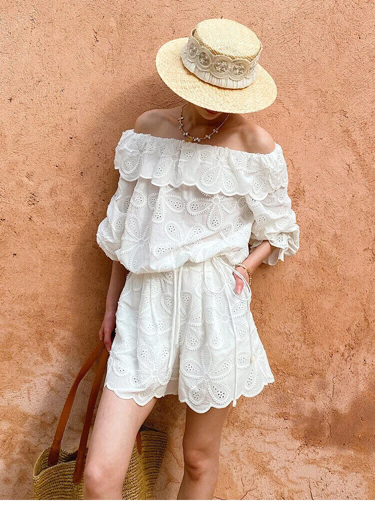 Step into effortless French chic with this 2026 spring – summer cotton co – ord set! The off – shoulder (boat neck) top comes with delicate embroidery and cutout details, and it’s paired with matching shorts to create a cohesive, breezy look. Made from 100% cotton, it’s soft, breathable and ideal for beach getaways, casual outings or sunny vacations. The three – quarter sleeves and scalloped edges add a touch of vintage elegance, while the white hue keeps it fresh and versatile for warm days.