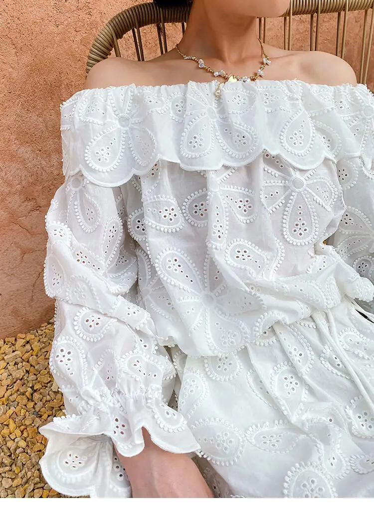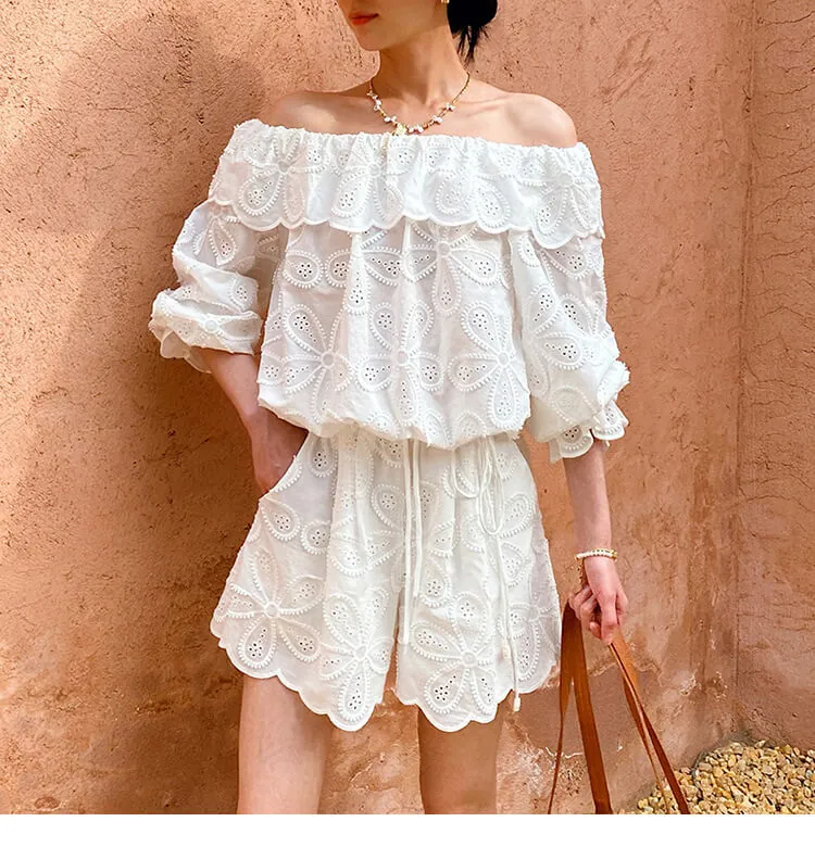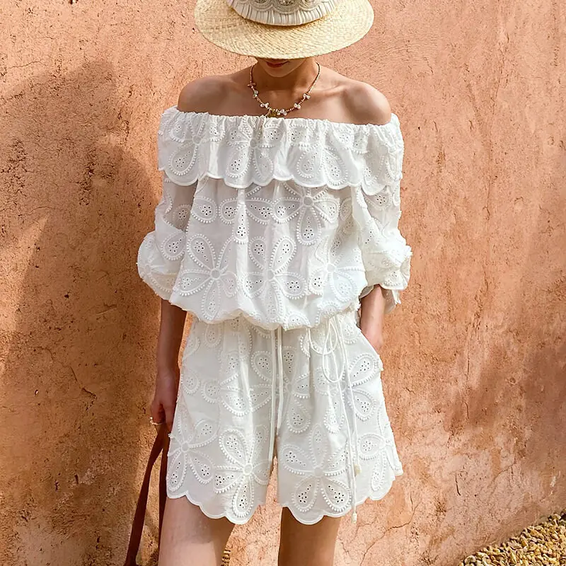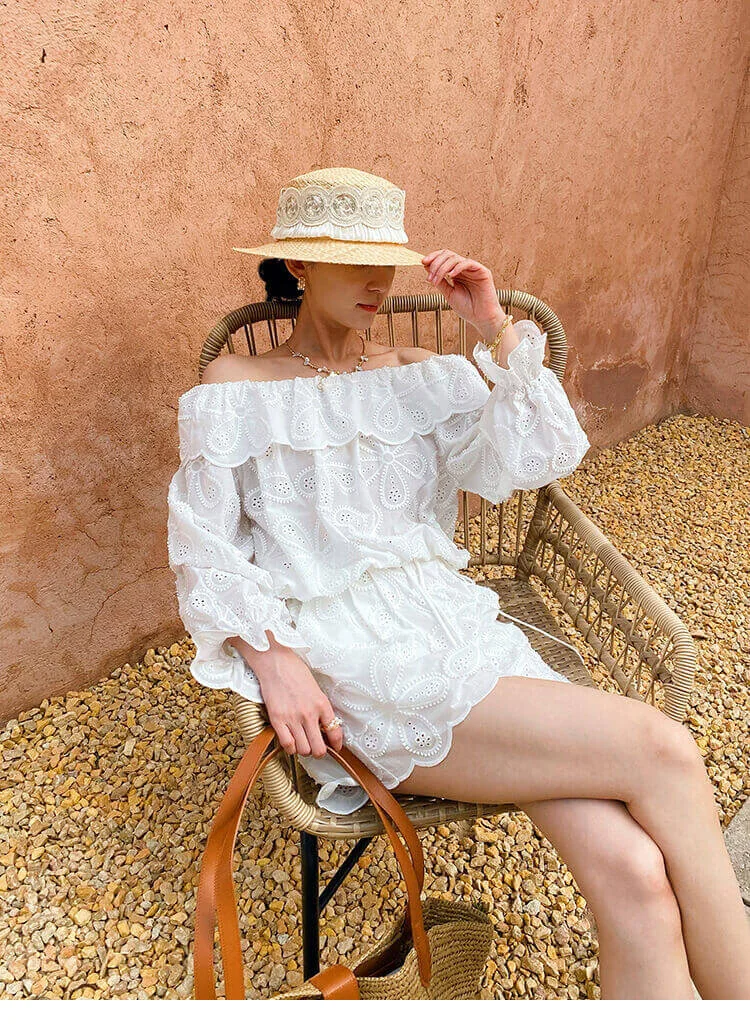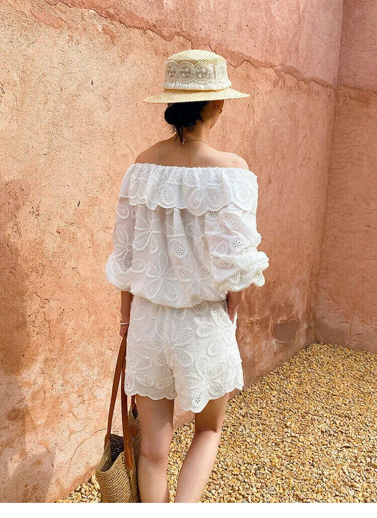 Step into effortless French chic with this 2026 spring – summer cotton co – ord set! The off – shoulder (boat neck) top comes with delicate embroidery and cutout details, and it’s paired with matching shorts to create a cohesive, breezy look. Made from 100% cotton, it’s soft, breathable and ideal for beach getaways, casual outings or sunny vacations. The three – quarter sleeves and scalloped edges add a touch of vintage elegance, while the white hue keeps it fresh and versatile for warm days.