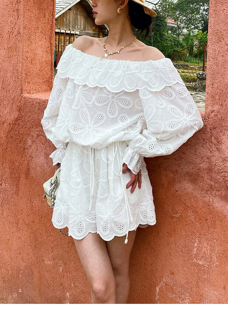 - Design: Off – shoulder (boat neck), three – quarter sleeves, embroidery, cutout patterns, scalloped edges