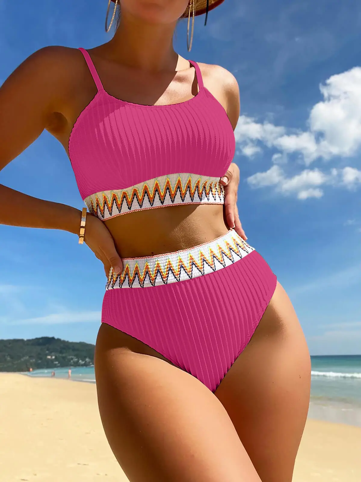 - Design: Two – piece bikini, high – waisted, ribbed texture, with underwire, without padding, decorative trim