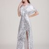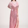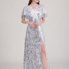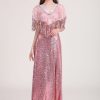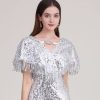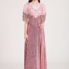 Women’s Party Dress Low V Back Cape Detailing Tassels Shinning Split Elegant Long Prom Dresses