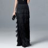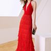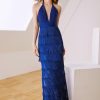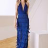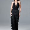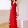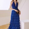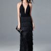 Women’s Sexy Deep V Neck Sleeveless Ruched Waist Tiered Tassels Fashion Long Party Dresses Elegant Runway Prom Dress