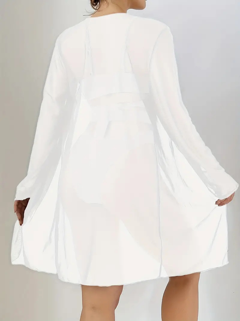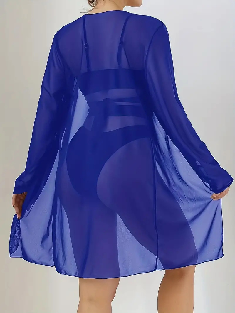 - Design Details: Long-sleeve sheer mesh cover-up, padded bikini top (no underwire), crisscross high-waist bikini bottom, solid color