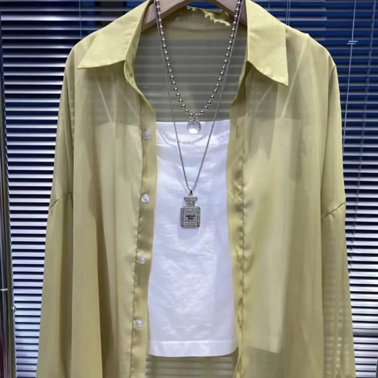 Women’s Shimmer Sheer Long Sleeve Loose Polo Collar Patchwork Blouse