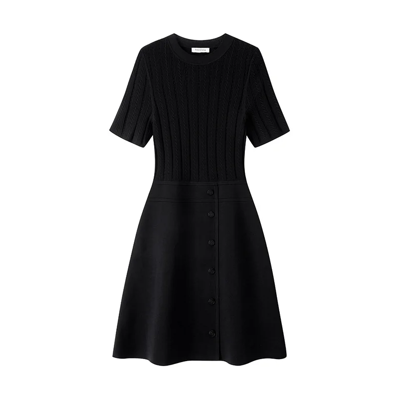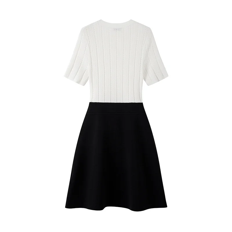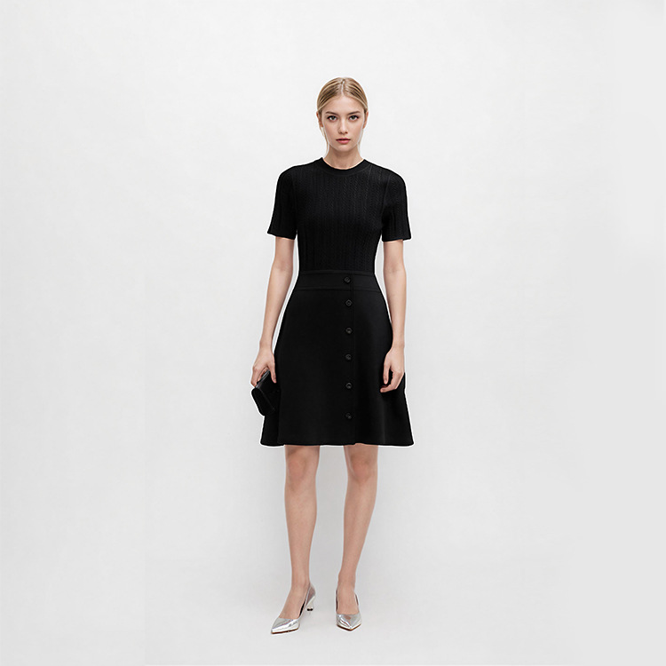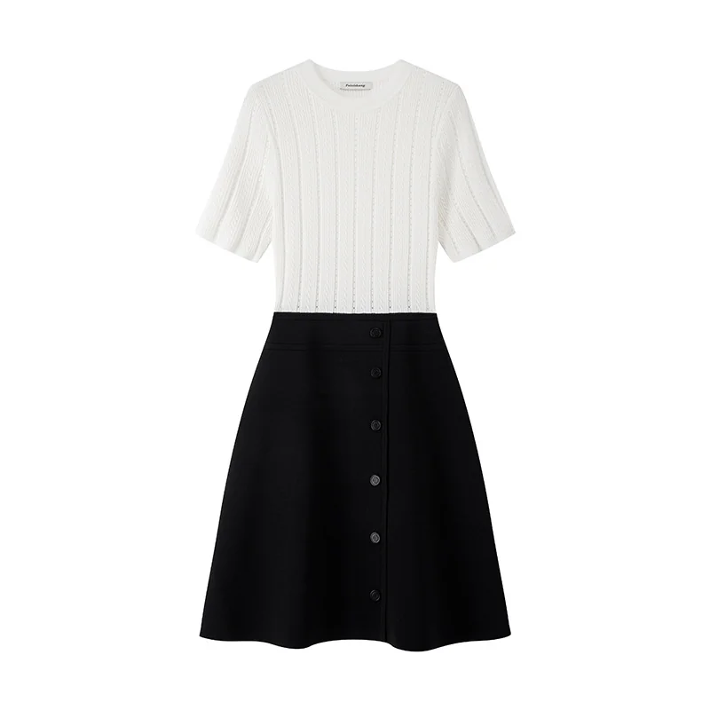 - Design Details: Crew neck, short regular sleeves, high waist, front button accents, patchwork craft, flared A-line hem