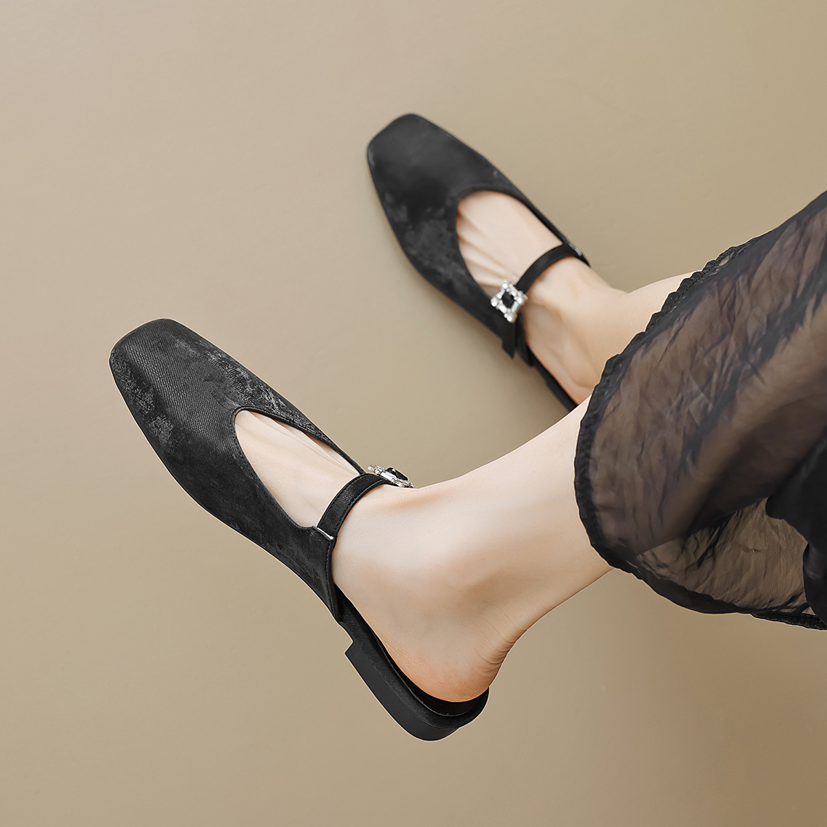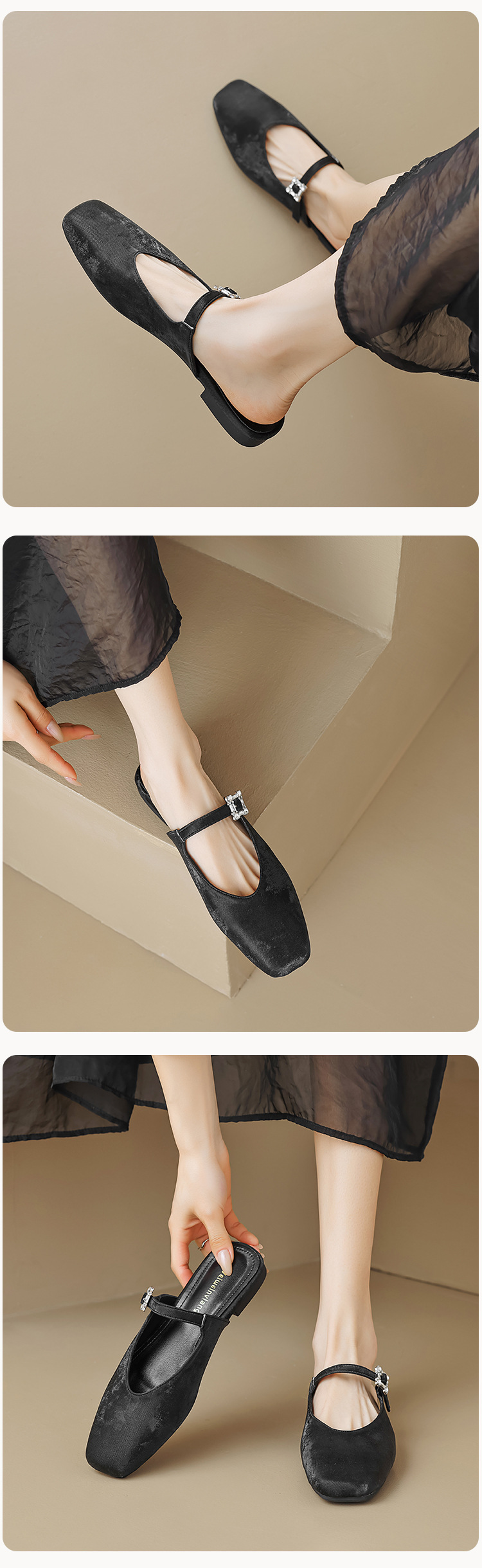 - Design: Square toe, ankle strap with decorative buckle, slip – on style, flat heel (2cm height)