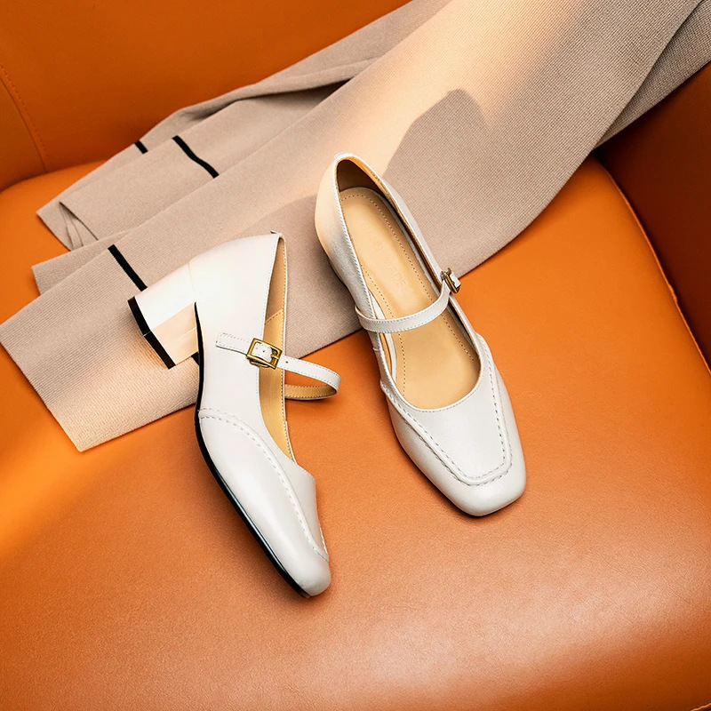 Women’s TopGrain Cowhide Mary Jane Square Toe Thick Heel Casual Shoes