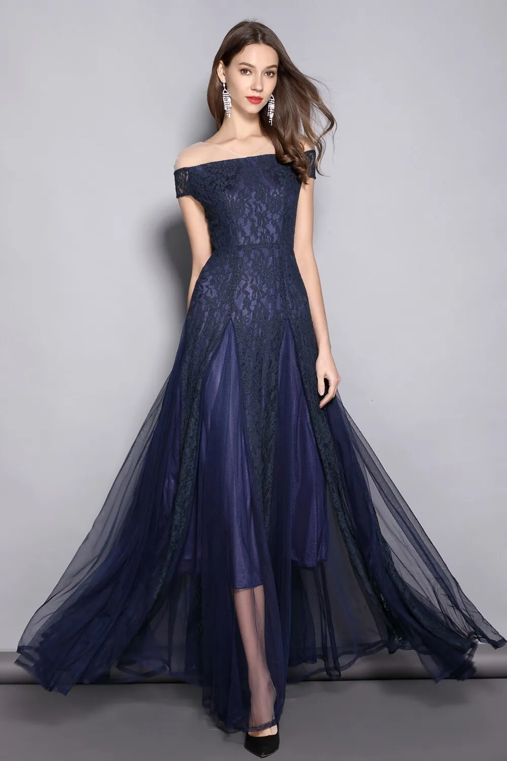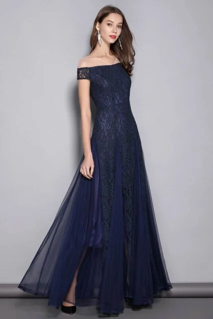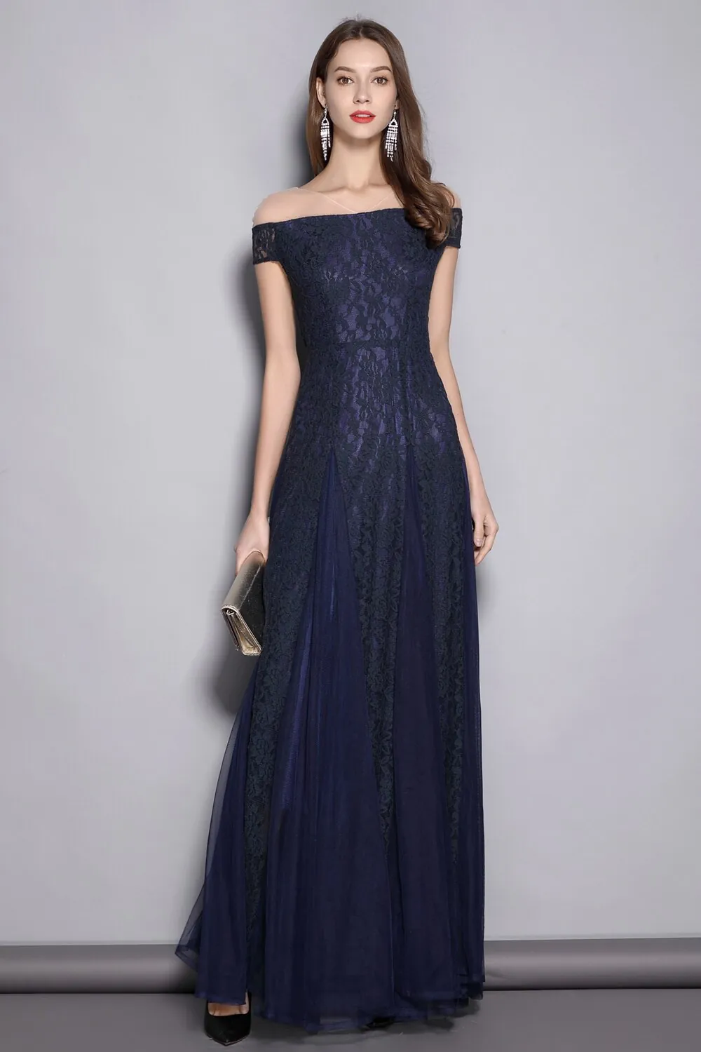 Womens Evening Party Prom Slash Neckline Long Sleeves Appliques Sequined Patchwork Maxi Elegant Dresses