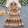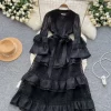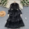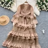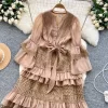 Womens Vintage A-Line Lace Dress V Neck Flare Sleeve Mid Calf Autumn Winter