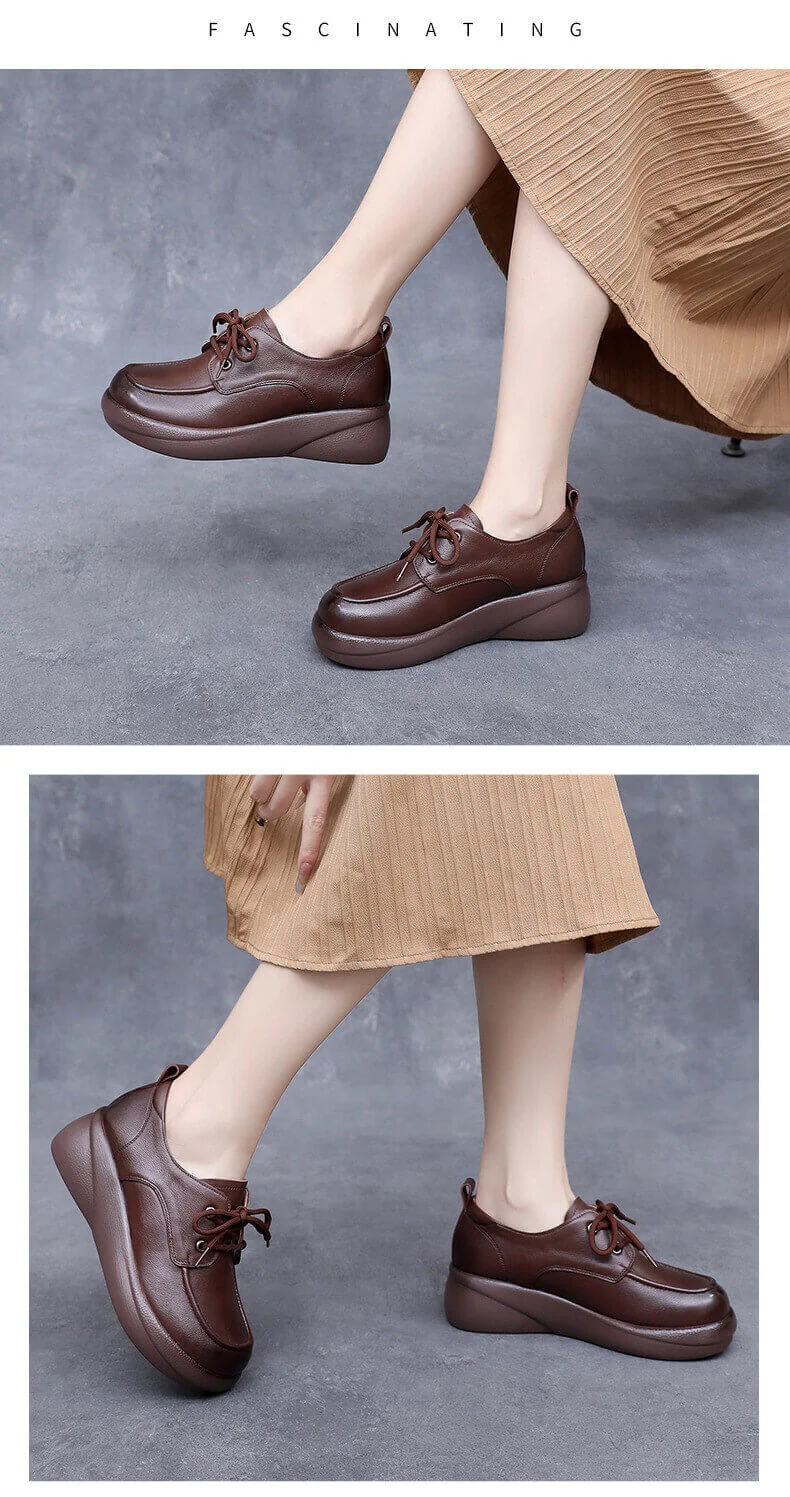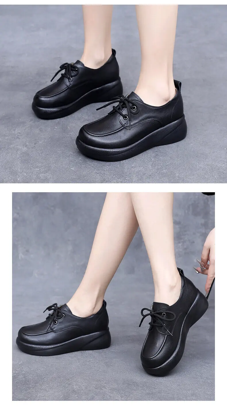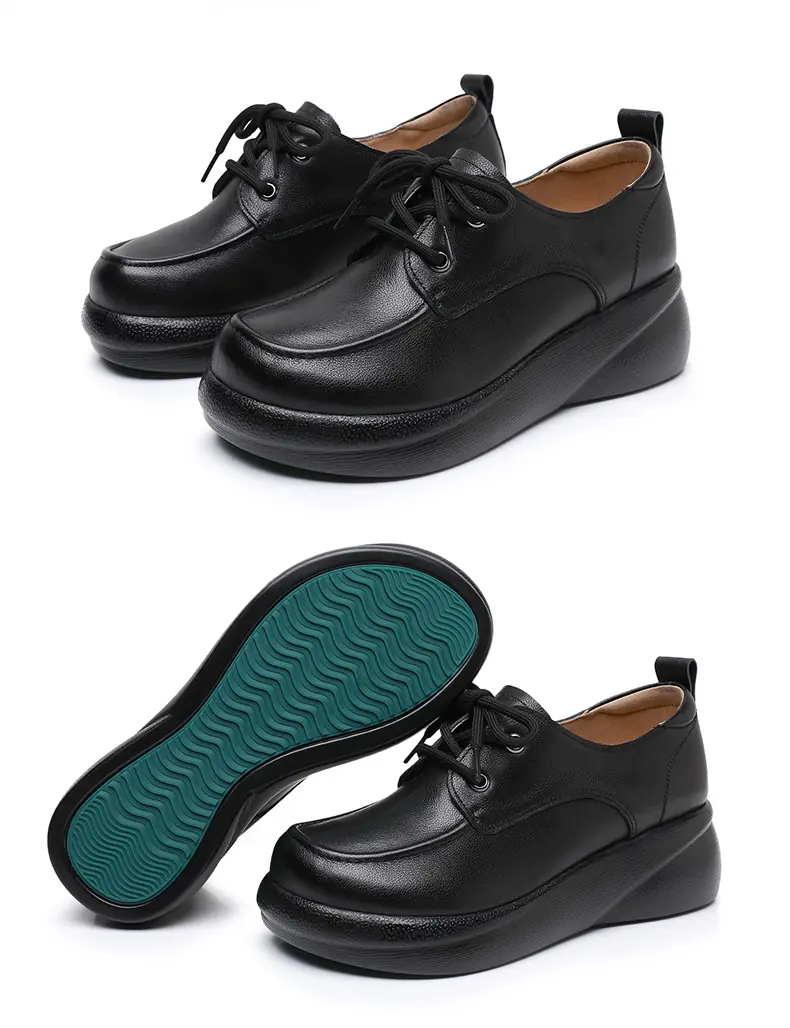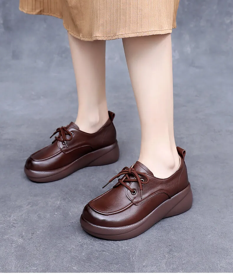 Womens Vintage British Leather Platform Loafers Lace Up Wide Chunky Heel