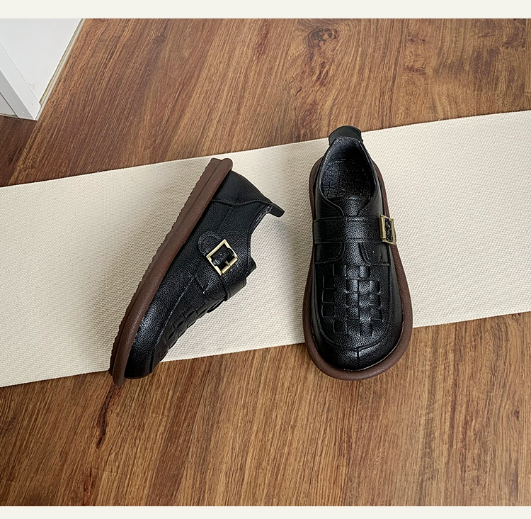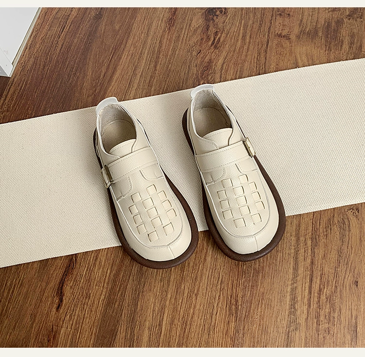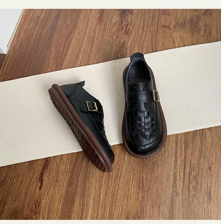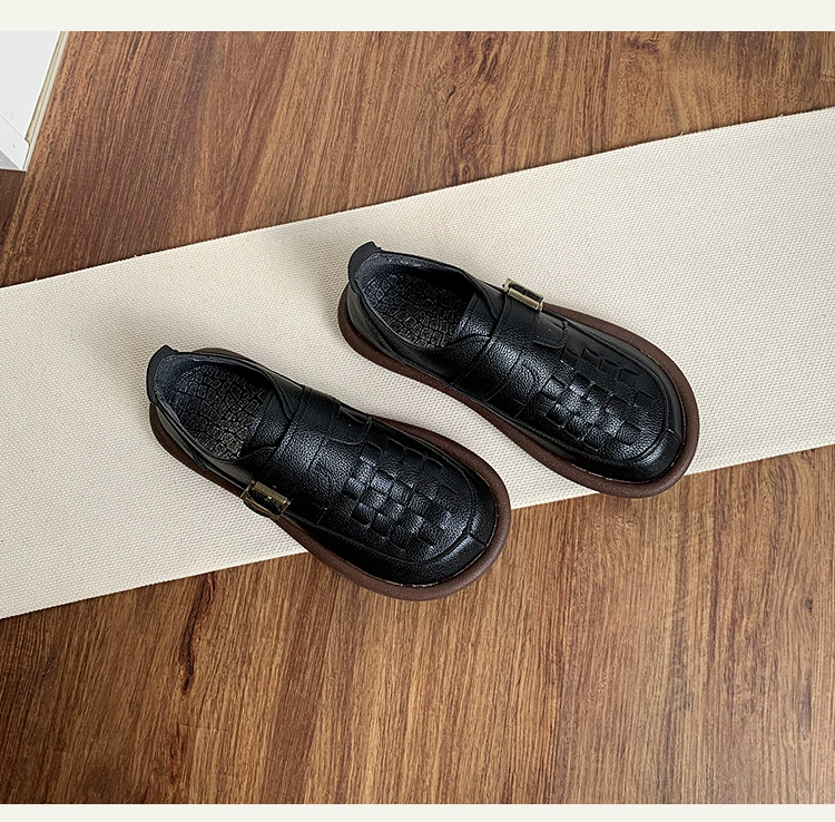 - Design Details: Round Toe, Belt Buckle, Woven Texture, Slip – On Closure, Deep Vamp, Flat Low Heel (1 – 3cm)